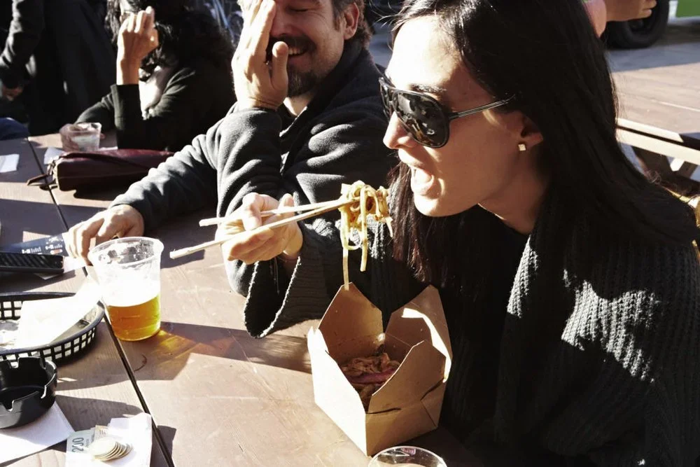 A diner enjoys adobo-marinated pork ramen with enoki mushrooms outdoors.